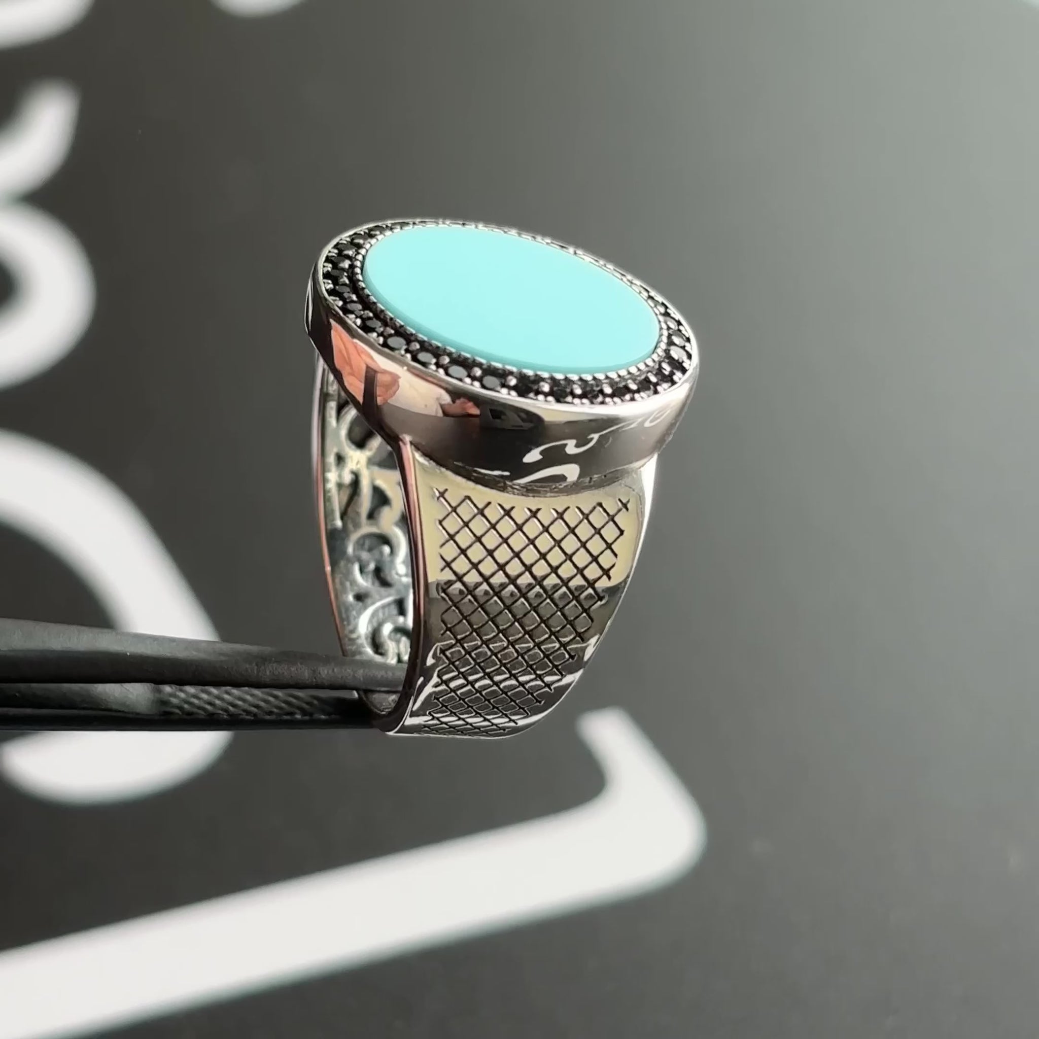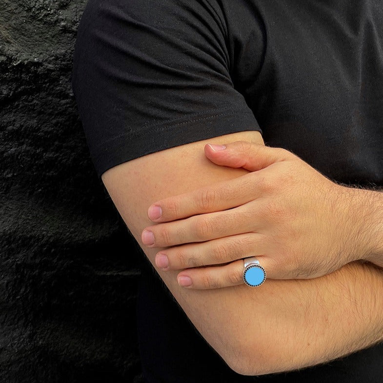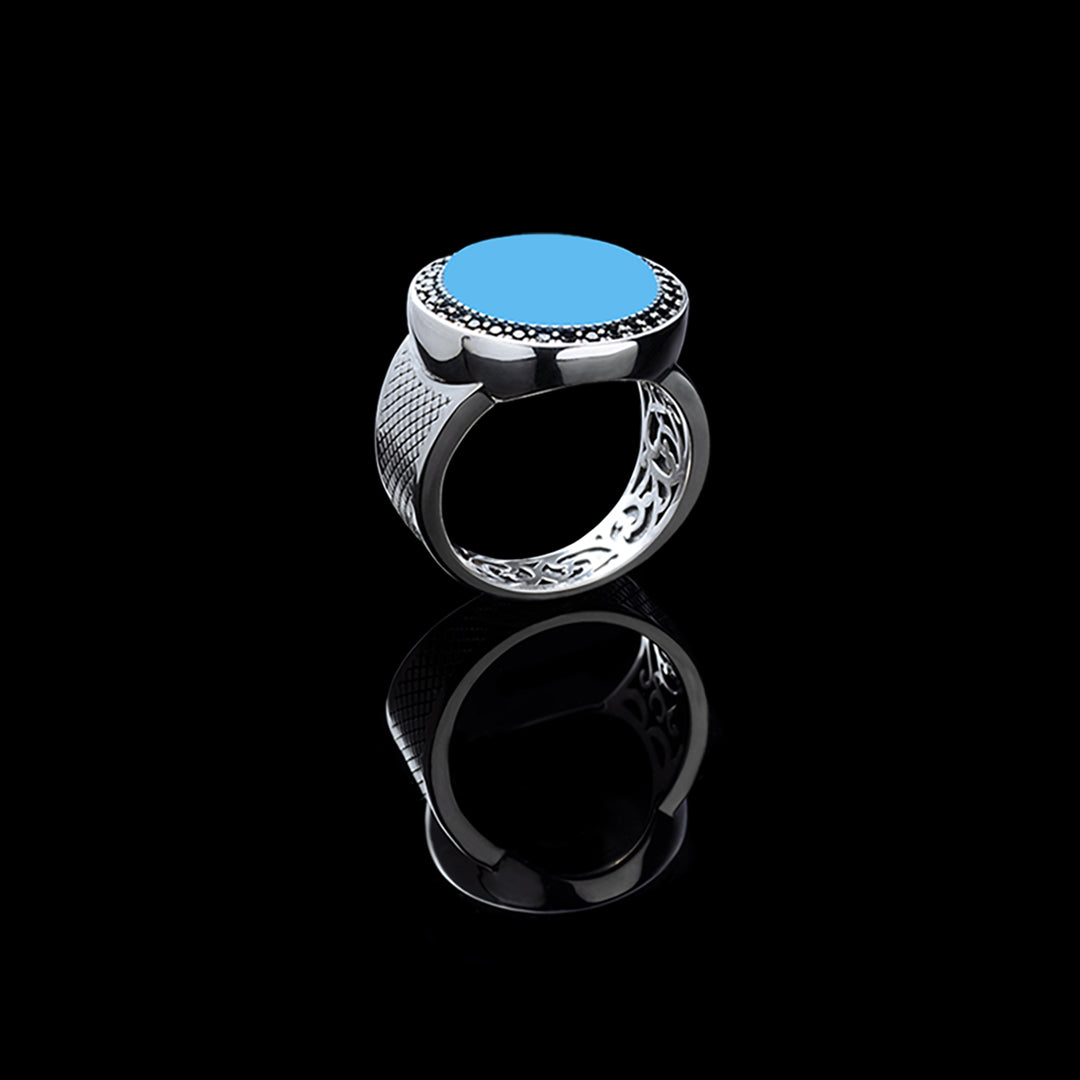 This 925 solid silver ring features a beautiful turquoise stone in the center, surrounded by black cubic zirconia stones. It's the perfect accessory for any special occasion, or just for adding a touch of antiquity to your everyday look.