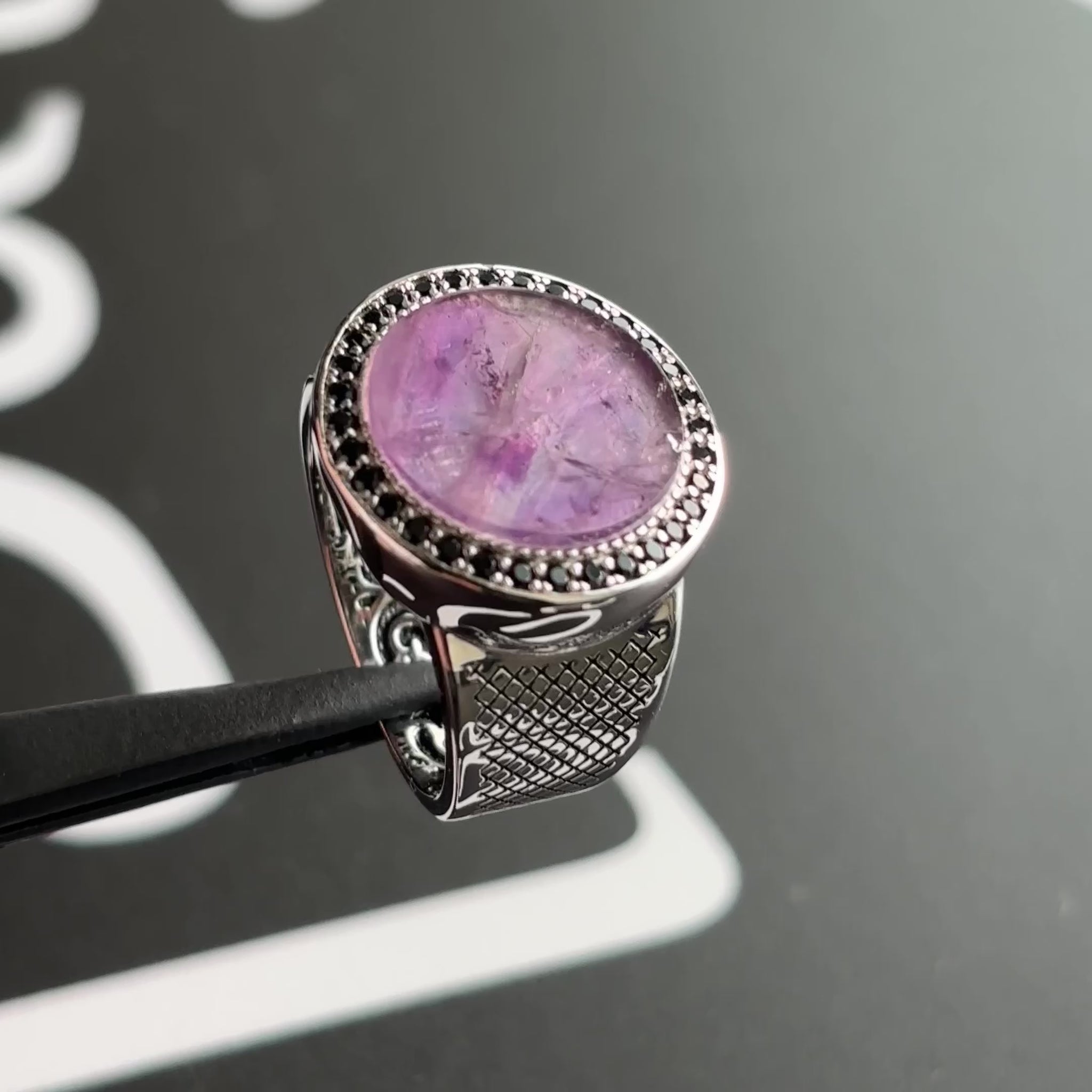Made from 925 silver, also known as sterling silver, with a main amethyst stone surrounded by black cubic zirconia stones.