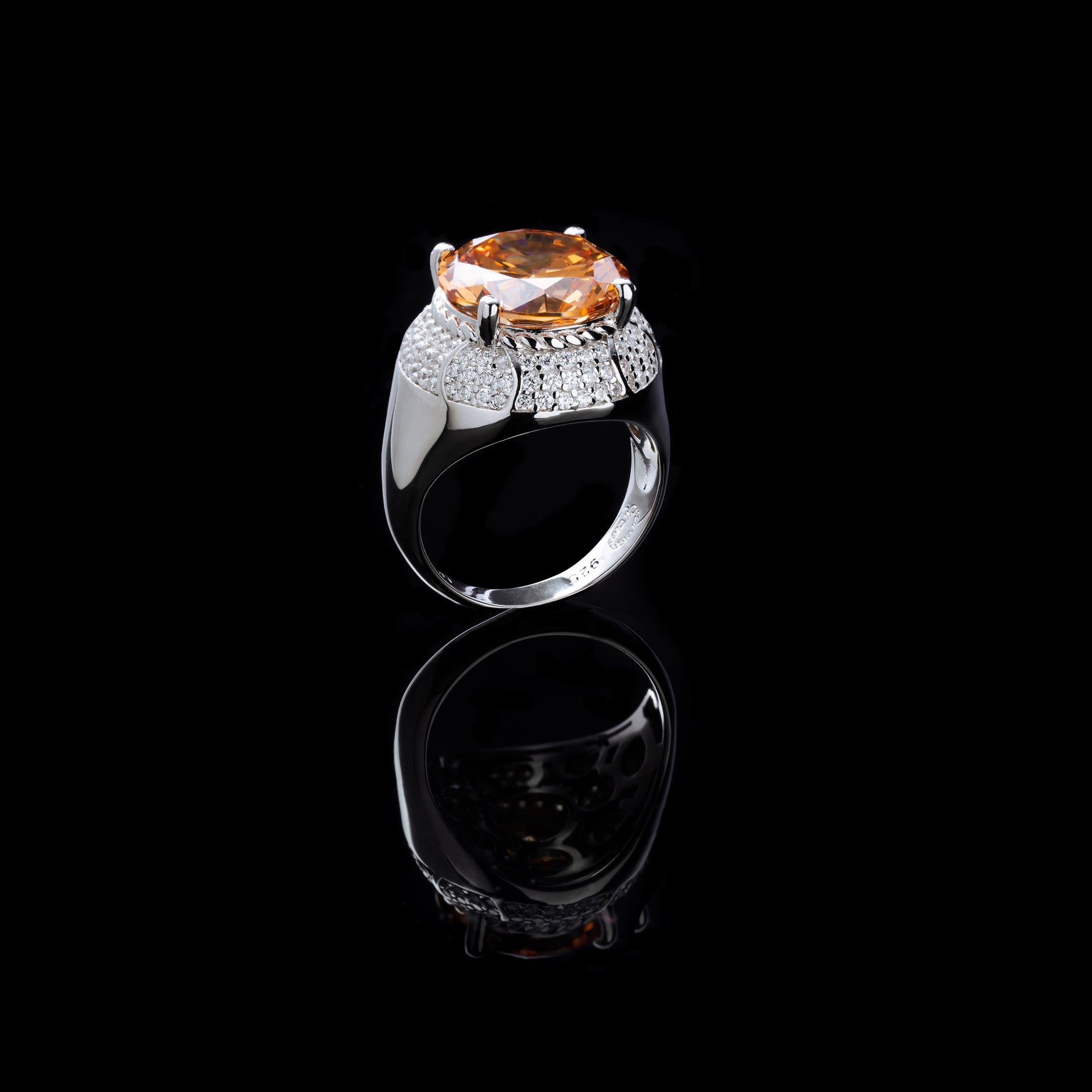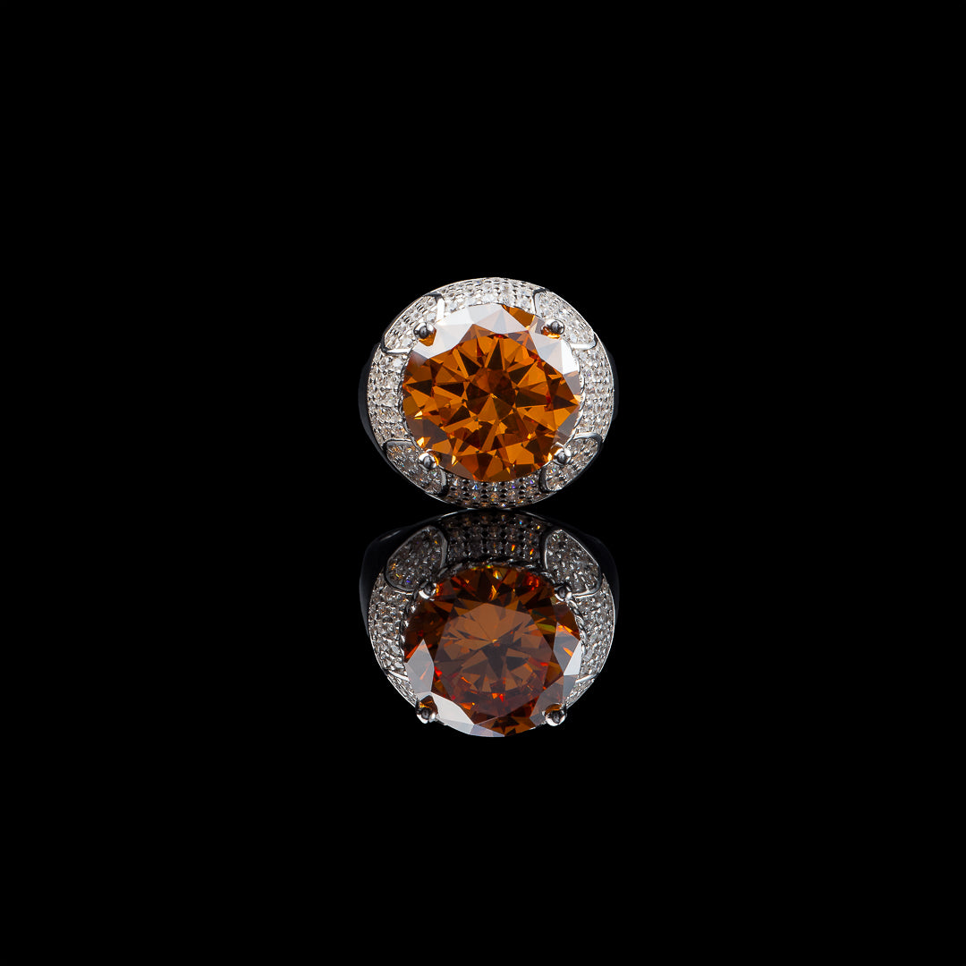 Made from 925 silver, also known as sterling silver, with a champagne faux-ruby at its center surrounded by cubic zirconia stones.